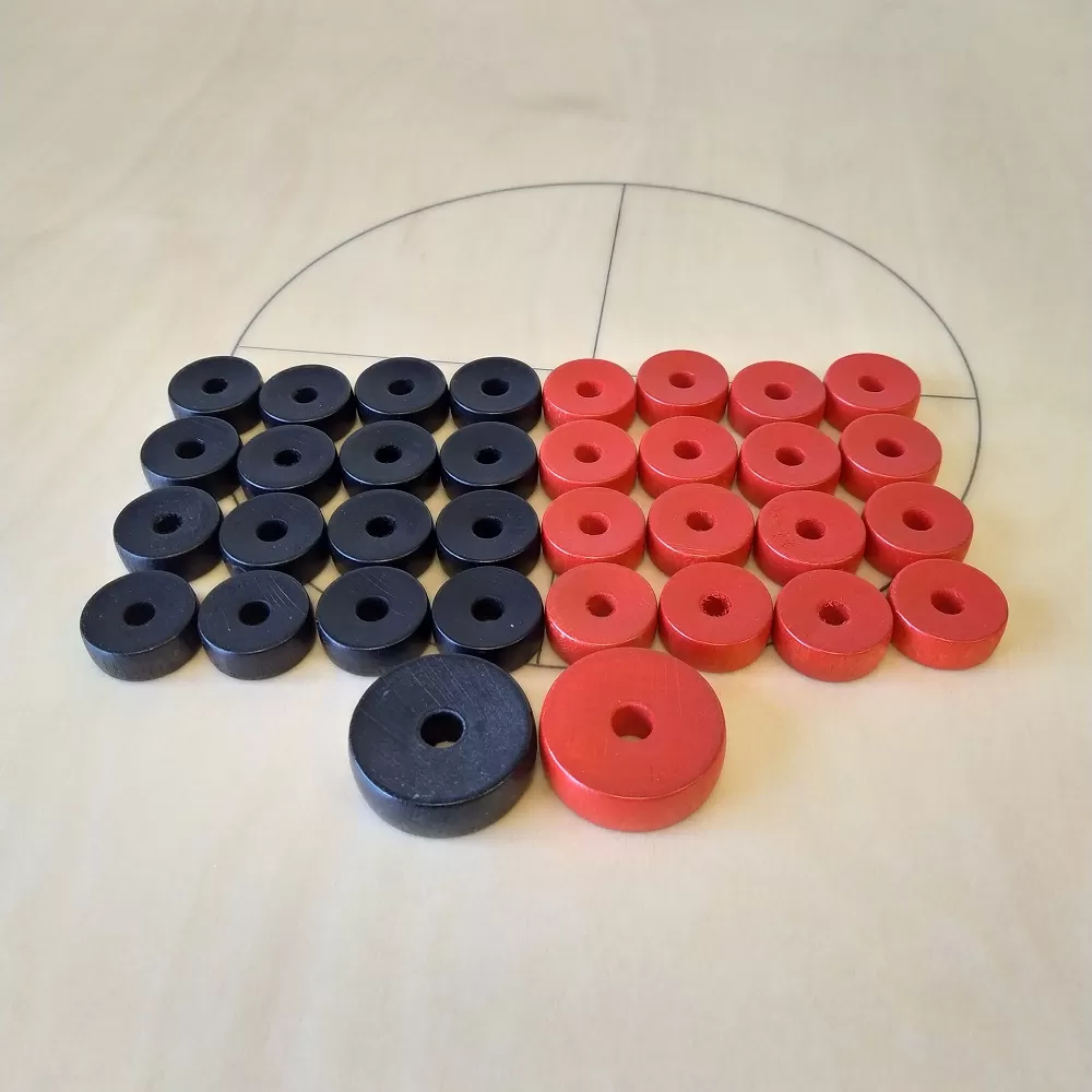 Novusa kauliņu komplekts. Komplektā ietilpst kauliņi un lielās ripas, kas izgatavotas no kvalitatīva bērza masīvkoka. Tie ir krāsoti ar tonētu, videi draudzīgu ūdens bāzes krāsu. Izmēri: kauliņš — ārējais diametrs 30 mm, augstums 12 mm, iekšējā cauruma diametrs 8 mm lielā ripa — ārējais diametrs 45 mm, augstums 15 mm, iekšējā cauruma diametrs 10 mm Komplektācija: 8 sarkani un 8 melni kauliņi 2 lielās ripas